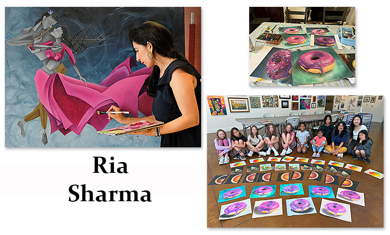 Bio: Ria is a versatile artist and Art teacher. A former civil engineer, transitioned into art in 2016, drawing on her technical background to develop a distinctive Cubist style. She reflects deep cultural stories of India and her journey as an immigrant in America. Ria repurposes traditional Indian textiles in her works. With eight solo exhibitions, participation in 50+ international shows and 20+ awards, her work has been featured in multiple publications in Dubai. Ria moved to the United States in 2020 after residing in Dubai for 20 years. Ria is an immigrant in America with an Indian origin. Ria has been teaching Art since 2017. She has taught at Palo Alto Art center, Pacific Art League and at her Studio. She Teaches, Chalk Patels, Charcoal, alcohol inks, watercolors, acrylic and architectural perspectives.
