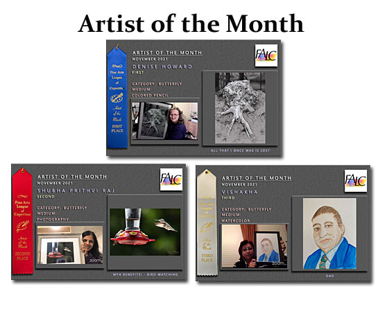 Pacific Art Leagues 100th Anniversary Exhibition: November 5, 2021 to January 24, 2022. OPENING RECEPTION: Friday, November 5th Exhibition Preview: 12pm-5pm Opening Celebration: 5:30pm - 8pm Awards Announcements: 7pm Encourage the falc artist participants in the show.