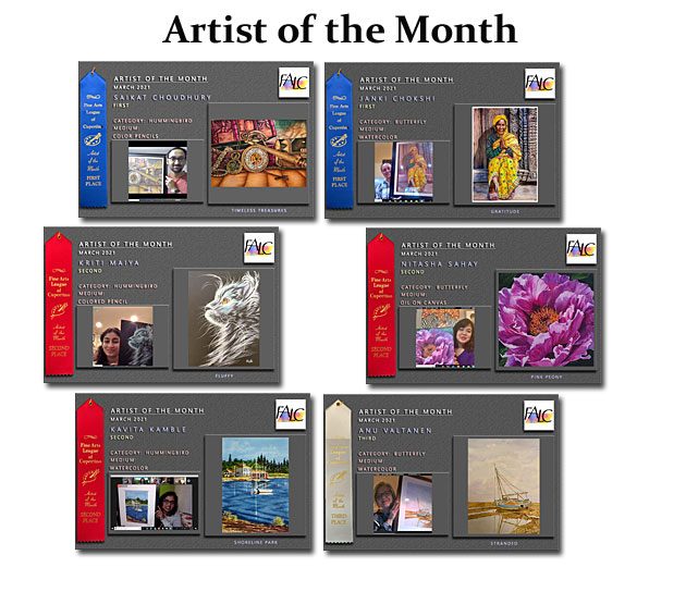To participate in FALC sponsored shows and exhibits, one must be juried in as a exhibiting member. Artists who have submitted 3 pieces of original art which meet with the approval and acceptance of the voting members will be awarded "Exhibiting Membership". Jurying in will take place at most meetings.