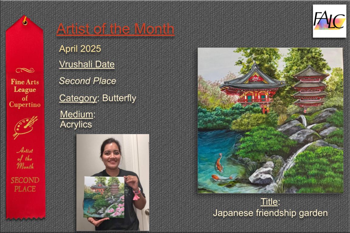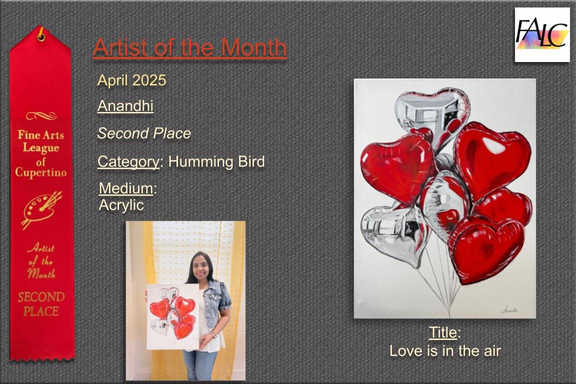Library Show: The Cupertino Library Foundation is working with the Cupertino Library and the Fine Arts League of Cupertino to bring Art Exhibits to the Cupertino Library. The Cupertino Library Foundation has committed resources to help sponsor various Art Displays inside the Library. All artists in Santa Clara County who work in 2D art are encouraged to submit their original artwork for display at the Cupertino Library. Email submissions or questions to: libraryart@cupertinolibraryfoundation.org For more information, visit: https://www.cupertinolibraryfoundation.org/art Next Theme: Spring Fever. Size of the artwork: artwork size including the frame 24"x 24" on any side. Show is going to change on June 1st and stay till Aug 1st. New theme will be updated on Library foundation website.