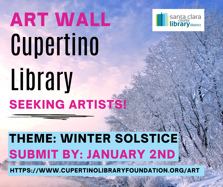 Library Show: The Cupertino Library Foundation is working with the Cupertino Library and the Fine Arts League of Cupertino to bring Art Exhibits to the Cupertino Library. The Cupertino Library Foundation has committed resources to help sponsor various Art Displays inside the Library. All artists in Santa Clara County who work in 2D art are encouraged to submit their original artwork for display at the Cupertino Library. Email submissions or questions to: libraryart@cupertinolibraryfoundation.org For more information, visit: https://www.cupertinolibraryfoundation.org/art Theme: Water. Size of the artwork: artwork size including the frame 24"x 24" on any side. Show is going to change in january. New theme will be updated on Library foundation website.