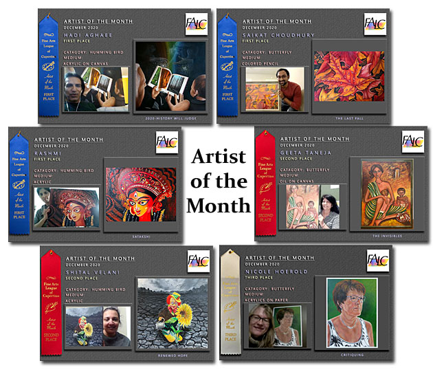 To participate in FALC sponsored shows and exhibits, one must be juried in as a exhibiting member. Artists who have submitted 3 pieces of original art which meet with the approval and acceptance of the voting members will be awarded "Exhibiting Membership". Jurying in will take place at most meetings.